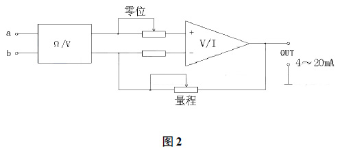 來自液位傳感器的對應液位高度的電阻信號,進入圖2所示的a,b端,經處理后*終輸出4~20mA DC標準信號。