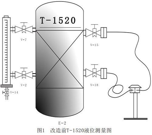 以溶劑吸收工段吸收塔T-1520為例,將該塔處的就地電遠傳磁翻板液位計改為反吹法測量液位,并且至中控室,使得T-1520原有的電遠傳磁翻板液位計LT-1510多一道對比和參考,對生產工藝的操作更有參考價值。