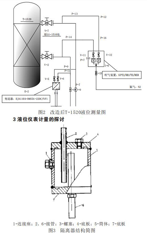對溶劑吸收工段吸收塔T-1520進行儀表改造,拆除原就地電遠傳磁翻板液位計,在原就地液位計處增加一套反吹法測量設備。增加的儀表有:普通磁性浮子液位計1臺:EJA110A-DMS5A-22DC/NF1、反吹風裝置1套、球閥(DN10)3只,¢14不銹鋼管等。圖2為技術改造后的反吹法測量液位的安裝效果圖。