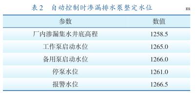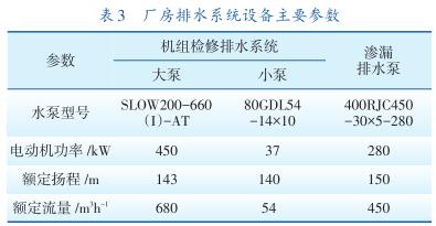 呼蓄電站廠房排水系統包括地下廠房滲漏排水系統、機組檢修排水系統。地下廠房滲漏排水系統設有1個滲漏集水井,有效容積364 m 3 ,設5臺滲漏排水泵,3運2備,系統*大滲漏總排水量為2250m 3 /h。滲漏排水泵正常運行時由廠內滲漏排水控制盤PLC或監控系統自動控制啟停,也可就地通過每臺泵的啟動柜手動啟停。自動控制時整定水位見表2。廠房排水系統設備主要參數見表3。
