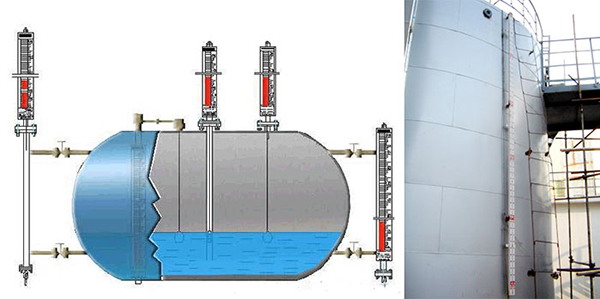 磁翻板液位計測量液體時采用頂裝或旁通管側裝方式。磁翻柱主體外加裝翻柱液位指示器、液位開關及液位變送器。磁單元置于浮球內部或通過頂桿與浮球相連,當浮球連帶磁單 元隨液位變化時,使磁性色塊(磁翻板)翻轉;磁性液位開關在對應液位點動作;同時液位傳感器在浮球磁力的作用下,輸出標準的變化電阻信號,再經過變送器把電阻信號轉換 成4~20mA電流信號輸出。
