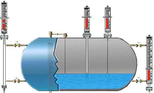液位計(jì)根據(jù)浮力原理,浮子在測量管內(nèi)隨液位的升降而上下移動(dòng),浮子內(nèi)的永久磁鋼通過磁耦合作用,驅(qū)動(dòng)紅、白色翻柱翻轉(zhuǎn)180’液位上升時(shí),翻柱由白色轉(zhuǎn)為紅色,下降時(shí),翻柱由紅色轉(zhuǎn)為白色,從而實(shí)現(xiàn)液位的指示。